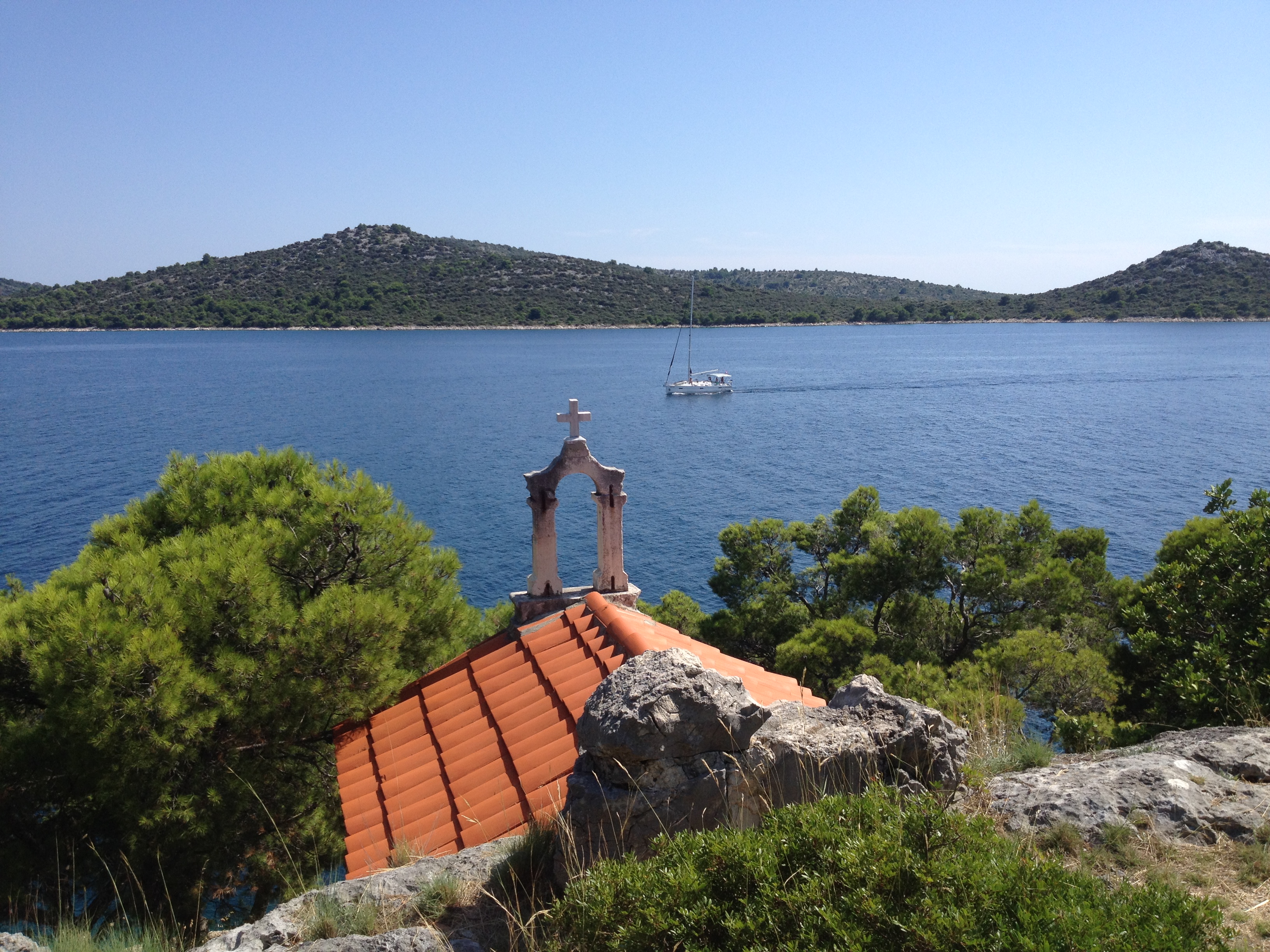 Mentre loro si spostano a nord noi procediamo verso sud: ben 4,3 miglia (!!!) da Primosten a Rogoznica. Vista la distanza riusciamo a partire alle 12,20. Mai visto nella nostra storia velica! Tanto per non farci rilassare troppo, comunque, l’amico Navtec, nonostante la splendida giornata, continua a segnalare “possibili temporali”…