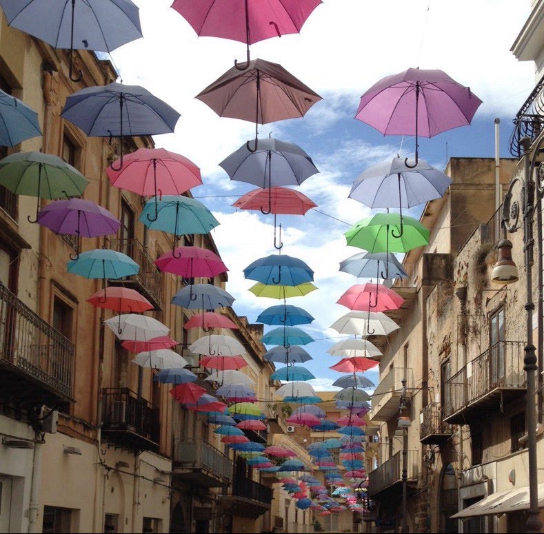 Bellissima la foto con gli ombrelli! Un po’ Mary Poppins un po’ Magritte, pero’ in un tripudio di colori.