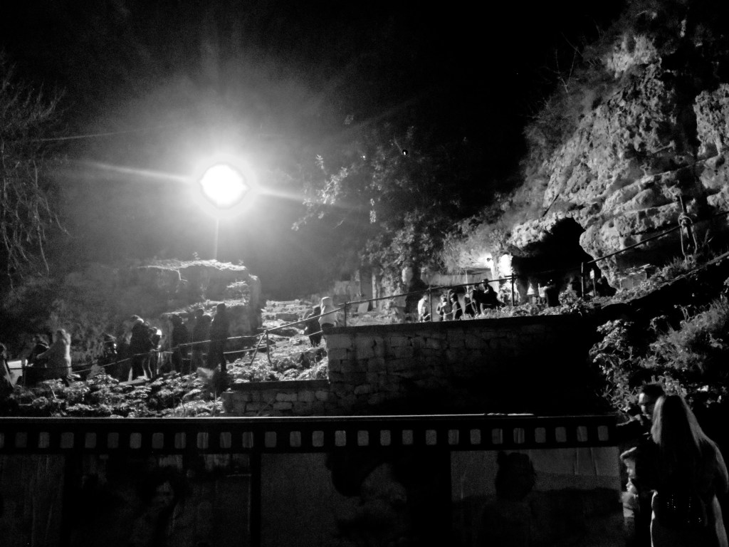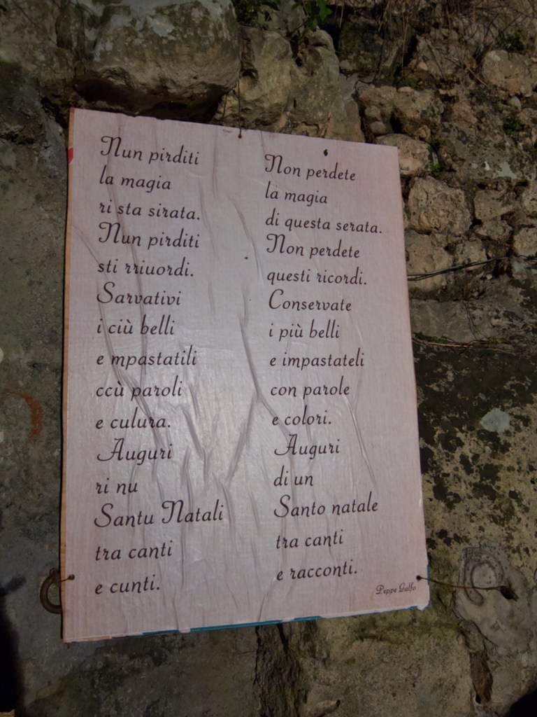 Ora, sopra di voi c’è un cielo blu intenso, cosparso di stelle e una piccola falce di luna. Sotto ai vostri piedi un sentiero di ghiaia e terra. Intorno grotte, scavate nella roccia di bianco calcare, coperte di muschio e gocciolanti acqua. Faló lungo le strade e, in lontananza, la cometa. Ad attendervi, per darvi il benvenuto, una voce d’angelo che racconta, cantando, la storia di un bambinello nato in una stalla.