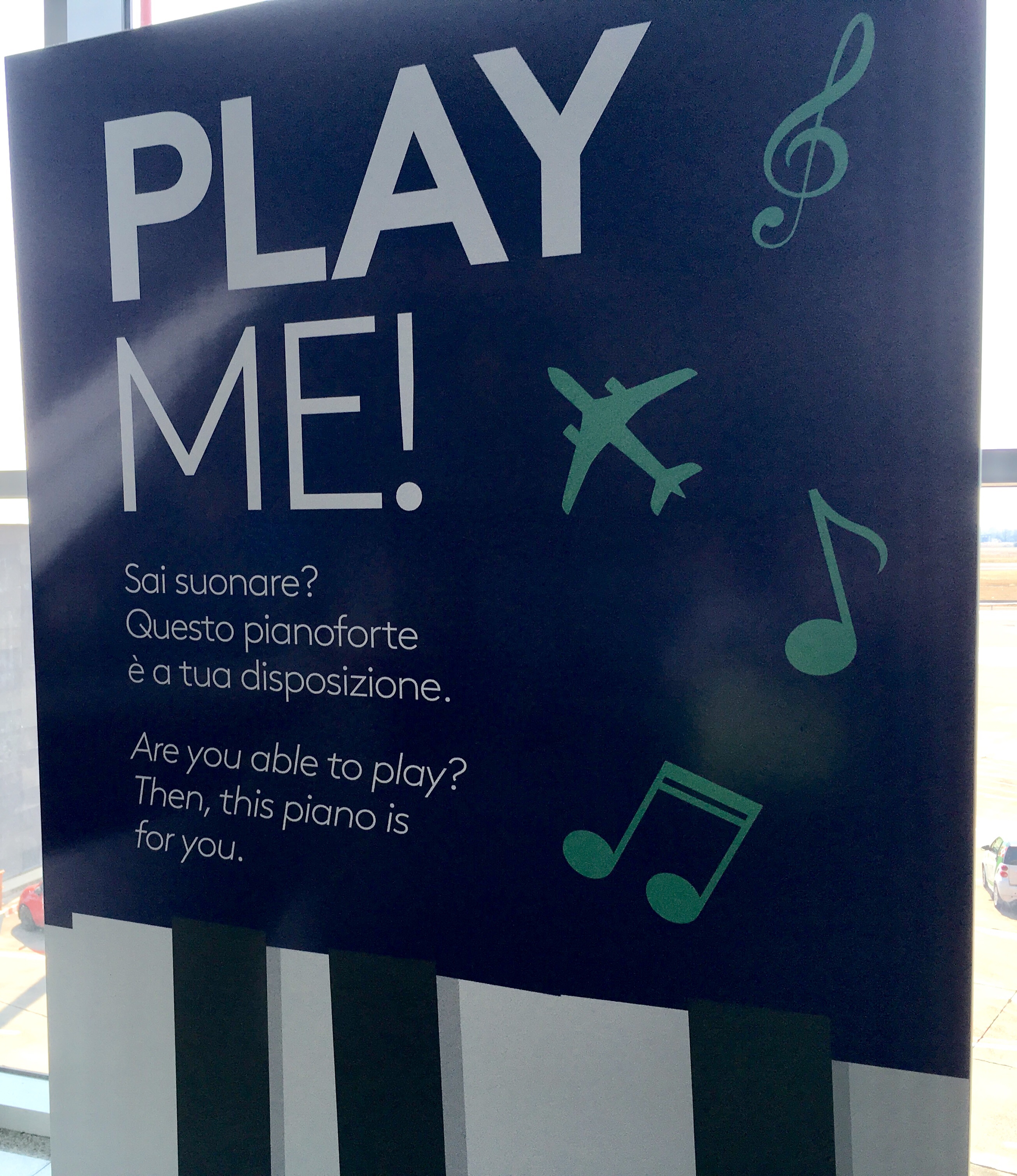 Il pianoforte è bianco e lucido, elegante e discreto nella sala d’aspetto dell’aeroporto. Non è più una novità. Da qualche tempo l’idea di lasciare uno strumento a disposizione di chi attende il proprio volo è diventata di moda e il cartellone lì accanto sottolinea la bella iniziativa.